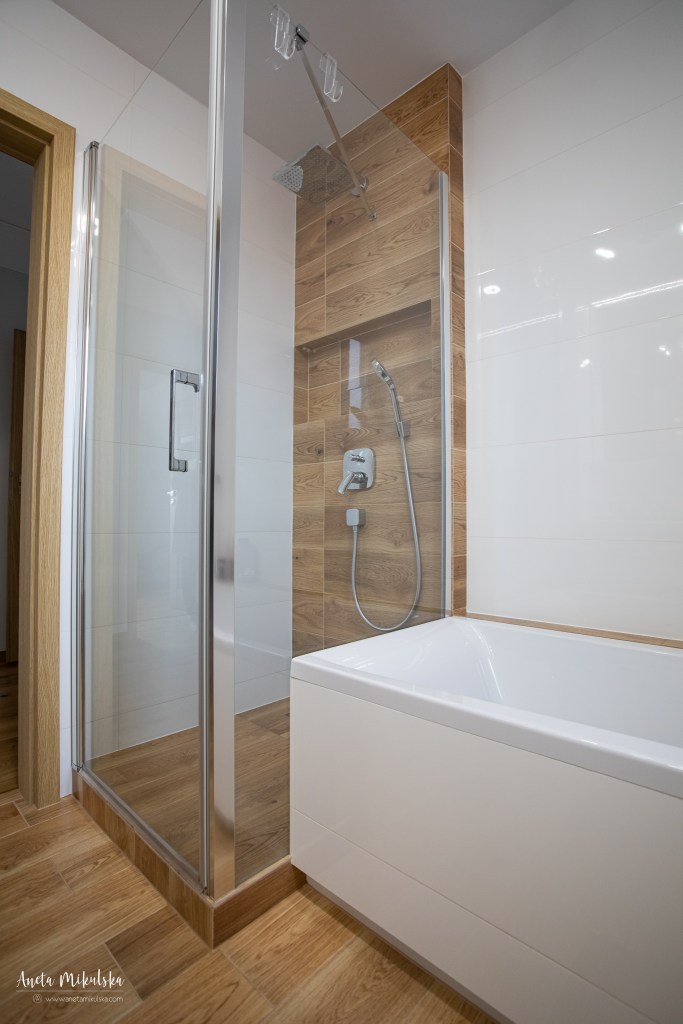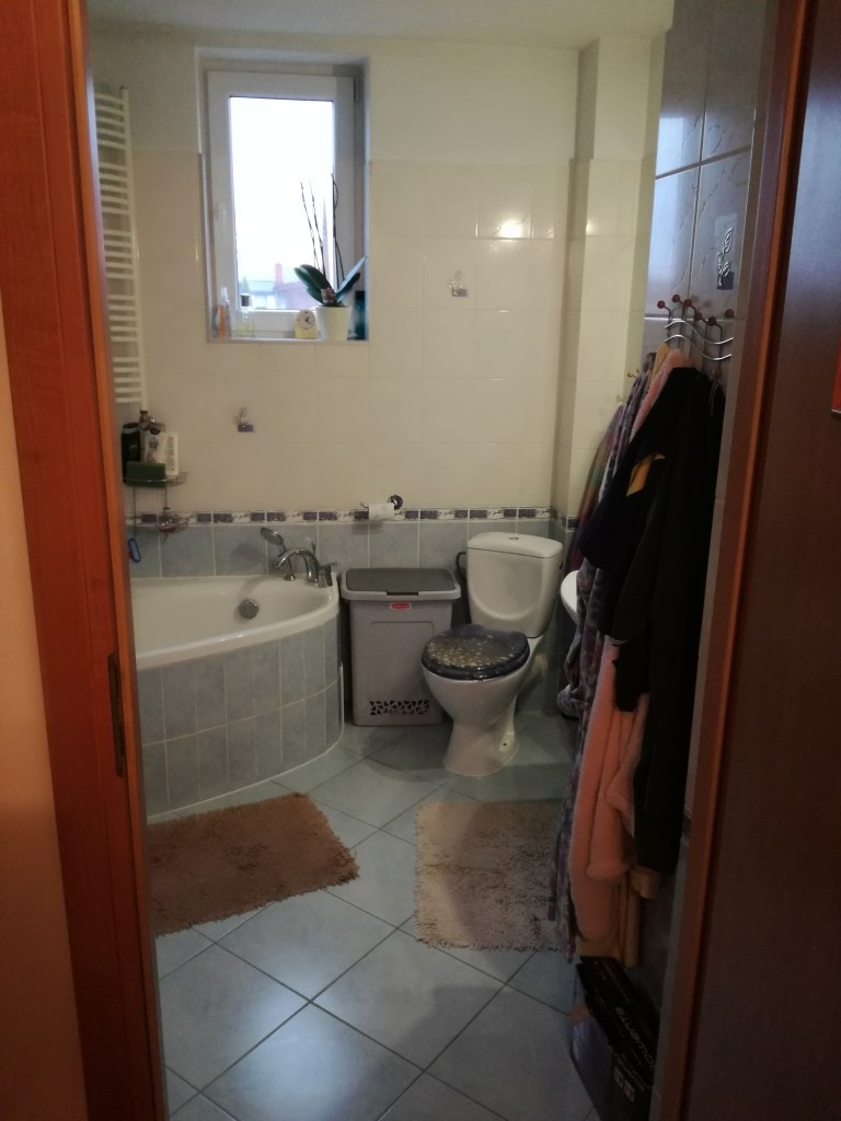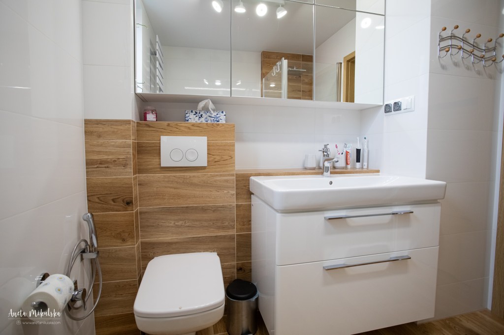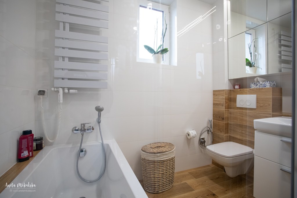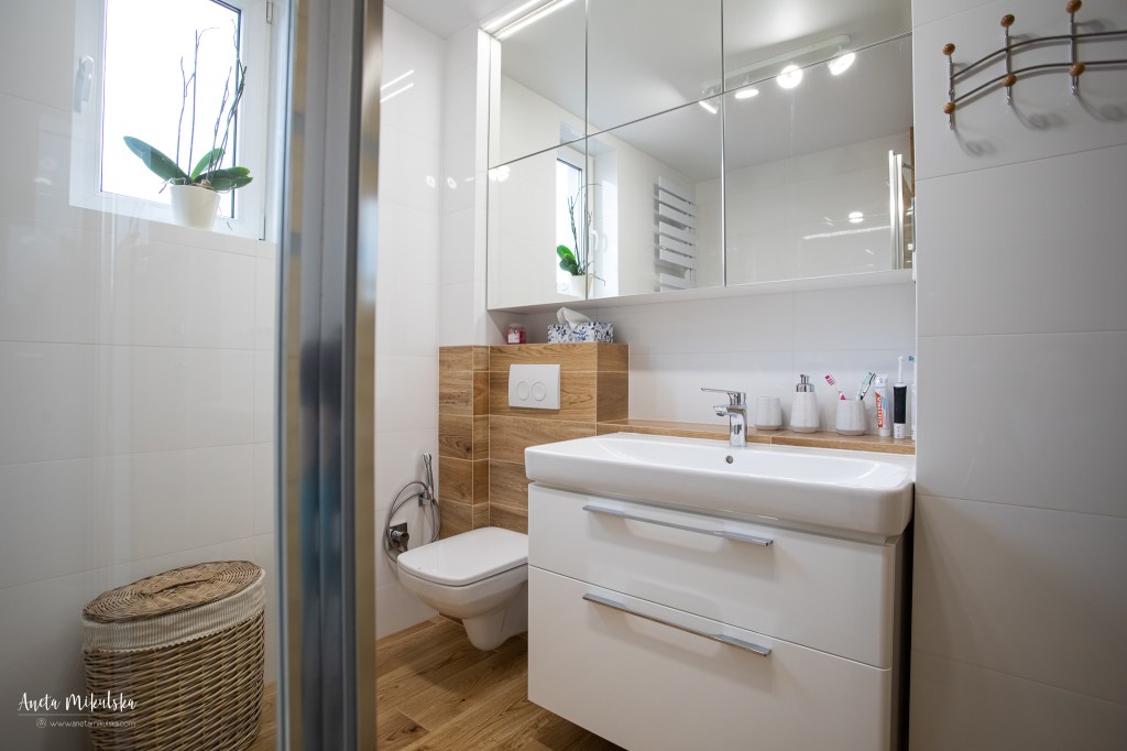 Największą metamorfozę przeszła łazienka: wanna narożna została zastąpiona wanną przyścienną, dzieląc pomieszczenie na 2 części: lewa (wanna i prysznic) i prawa umywalka i WC. Narożne WC zostało przeniesione na ścianę z umywalką. Po takich zmianach łazienka zyskała optycznie większą i uporządkowaną przestrzeń.
