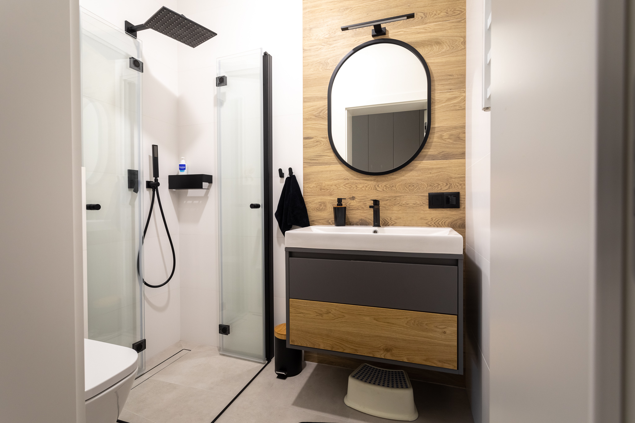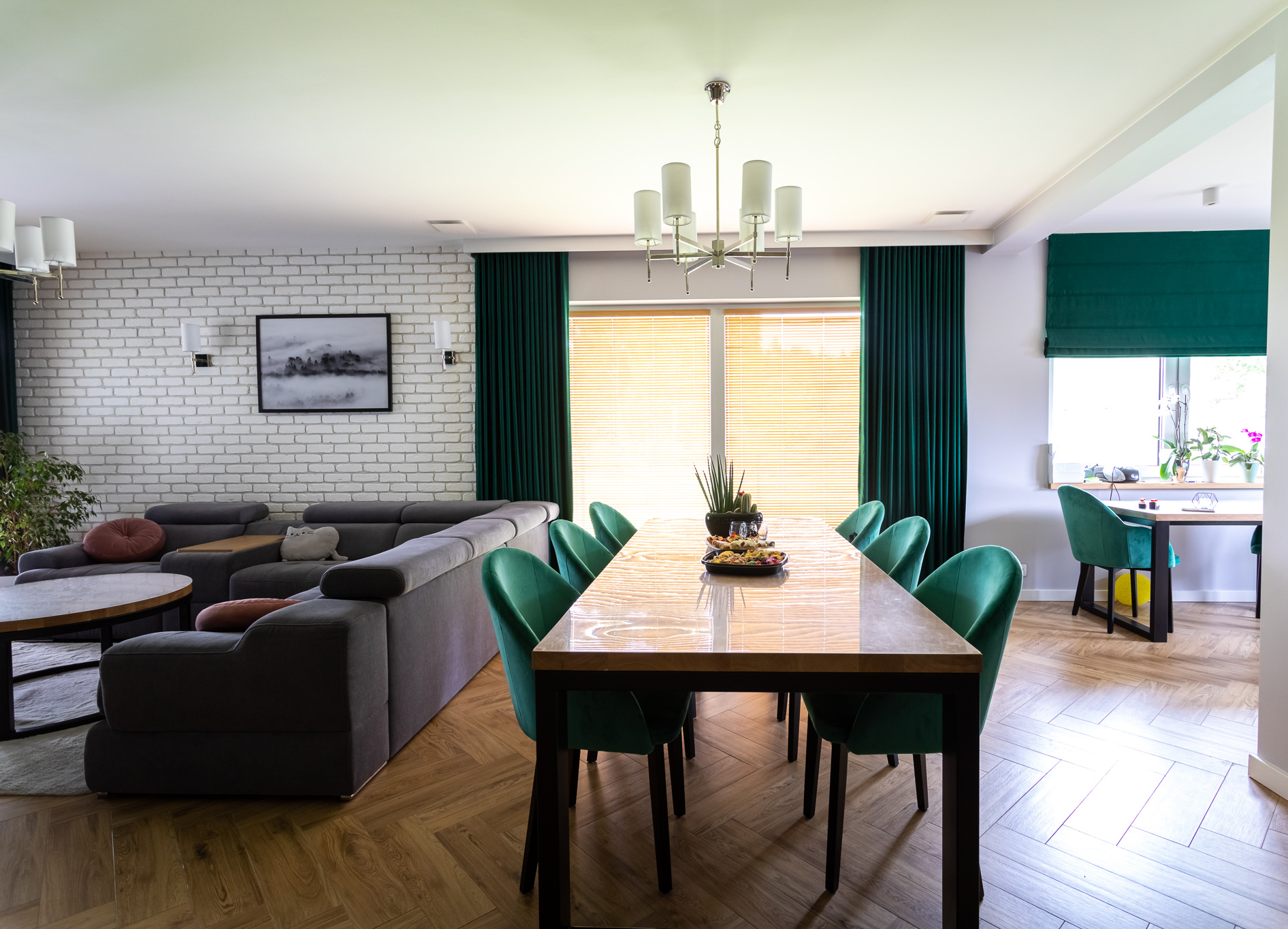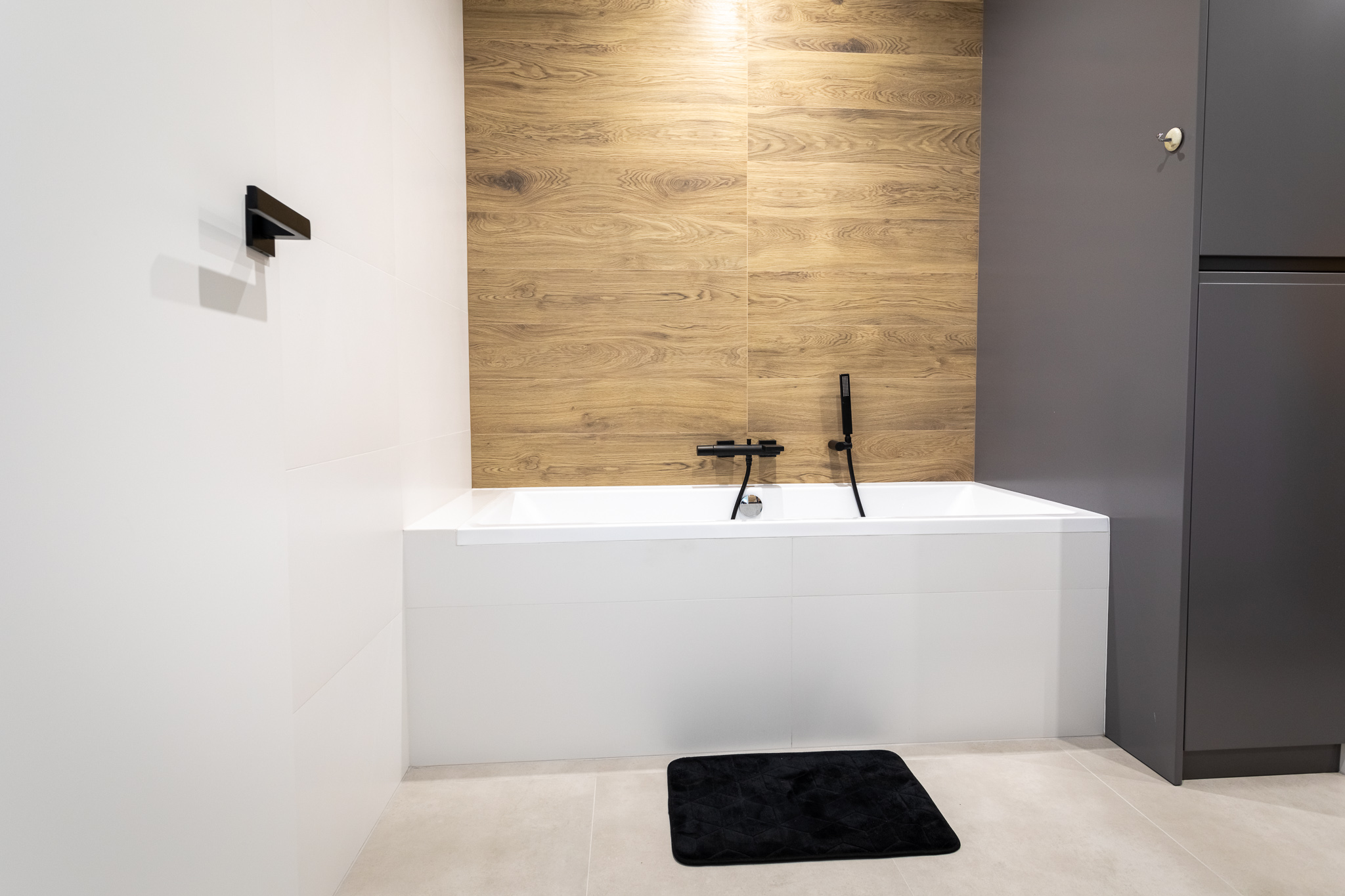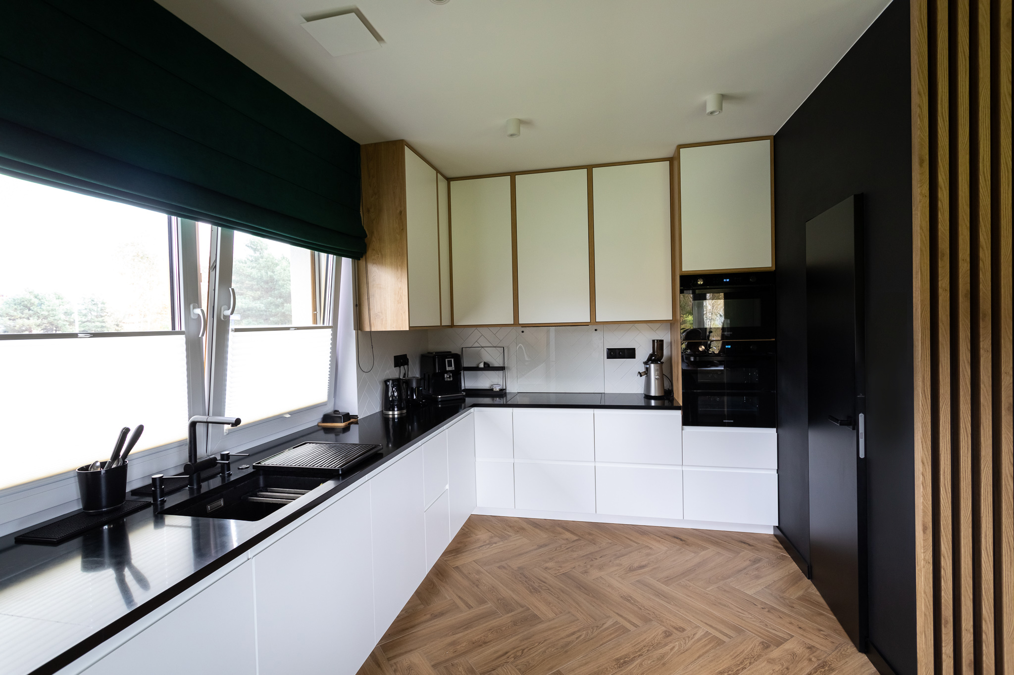 Projekt był pracochłonny ale efekt przerósł nasze oczekiwania. Wnętrza są spójne w fakturze i kolorystyce, jest klarowny podział na strefy. Udało nam się znaleźć przepiękne płytki podłogowe, które wyglądają jak drewno. Dom kryje kilka fajnych, nieoczywistych rozwiązań, jak wieszak na ręczniki w łazience montowany do sufitu, drzwi do spiżarni z ukrytą futryną.