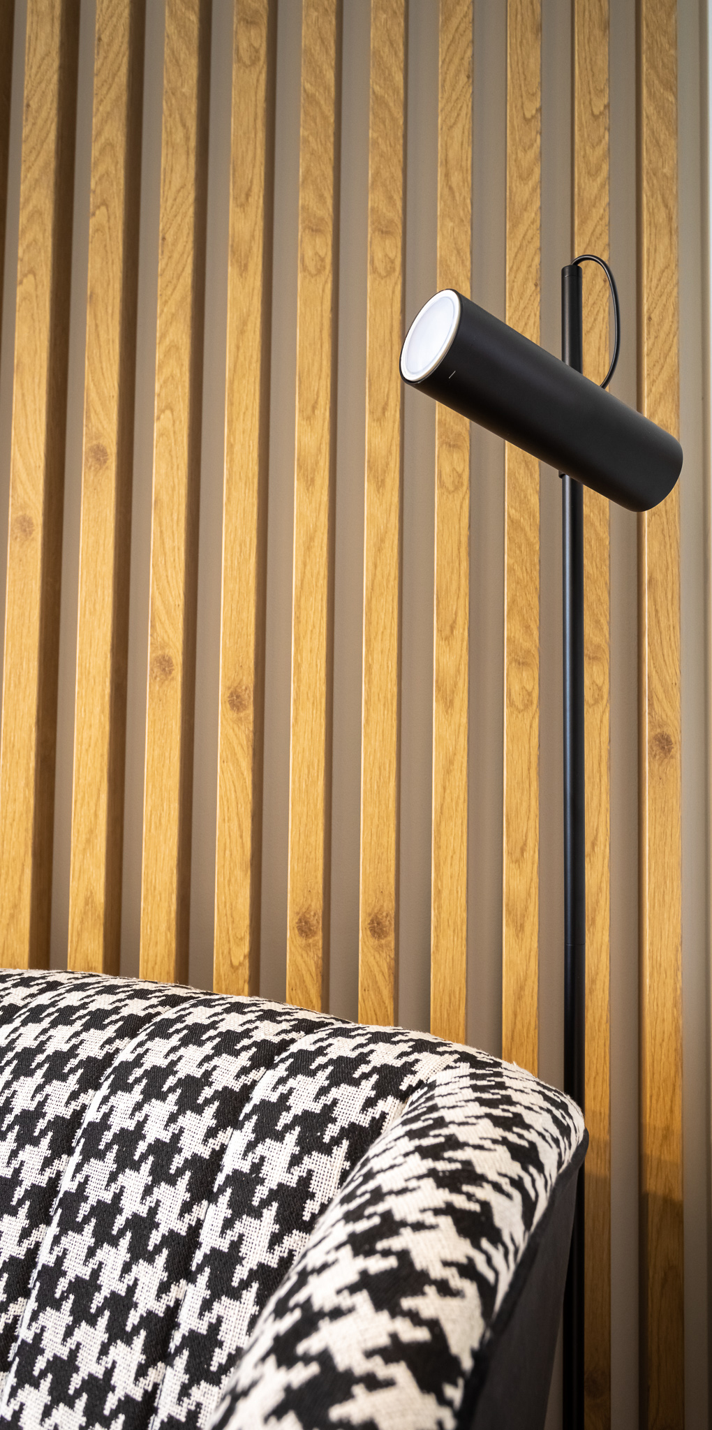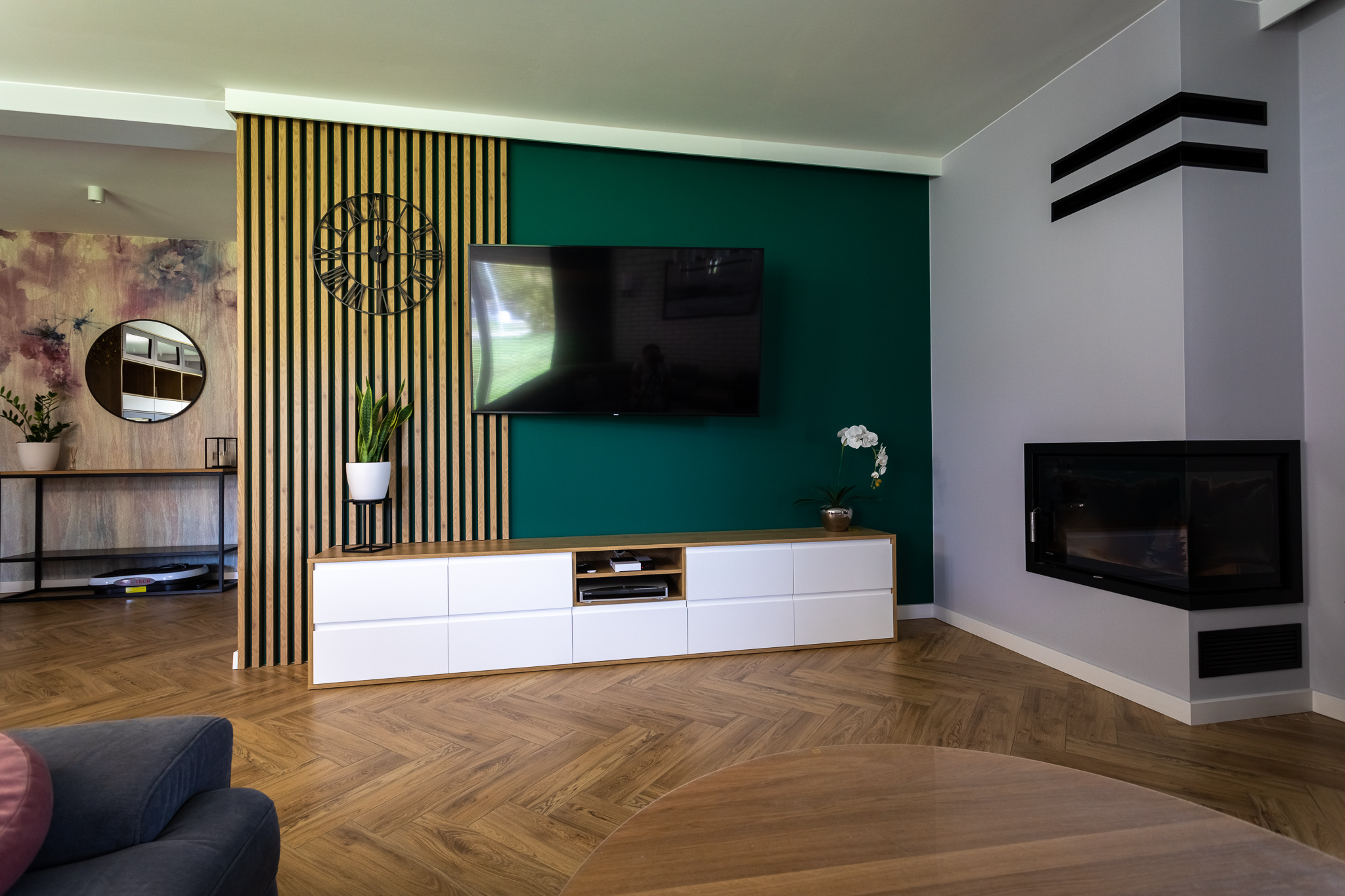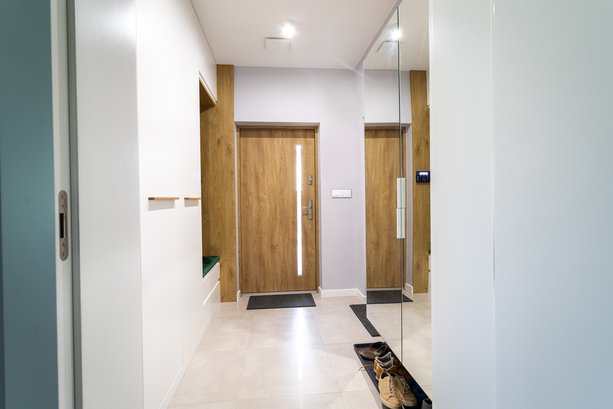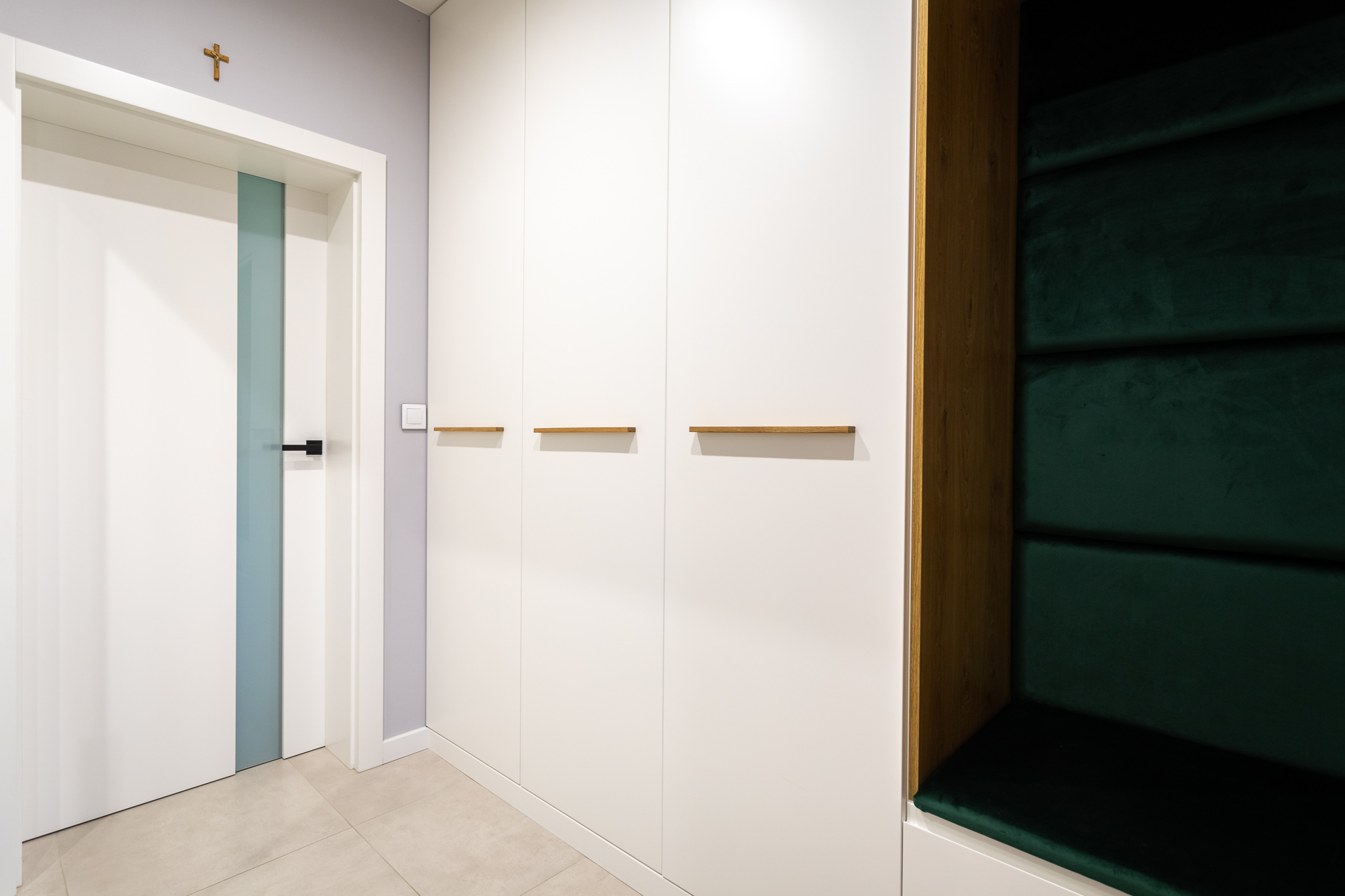 Projekt był pracochłonny ale efekt przerósł nasze oczekiwania. Wnętrza są spójne w fakturze i kolorystyce, jest klarowny podział na strefy. Udało nam się znaleźć przepiękne płytki podłogowe, które wyglądają jak drewno. Dom kryje kilka fajnych, nieoczywistych rozwiązań, jak wieszak na ręczniki w łazience montowany do sufitu, drzwi do spiżarni z ukrytą futryną.