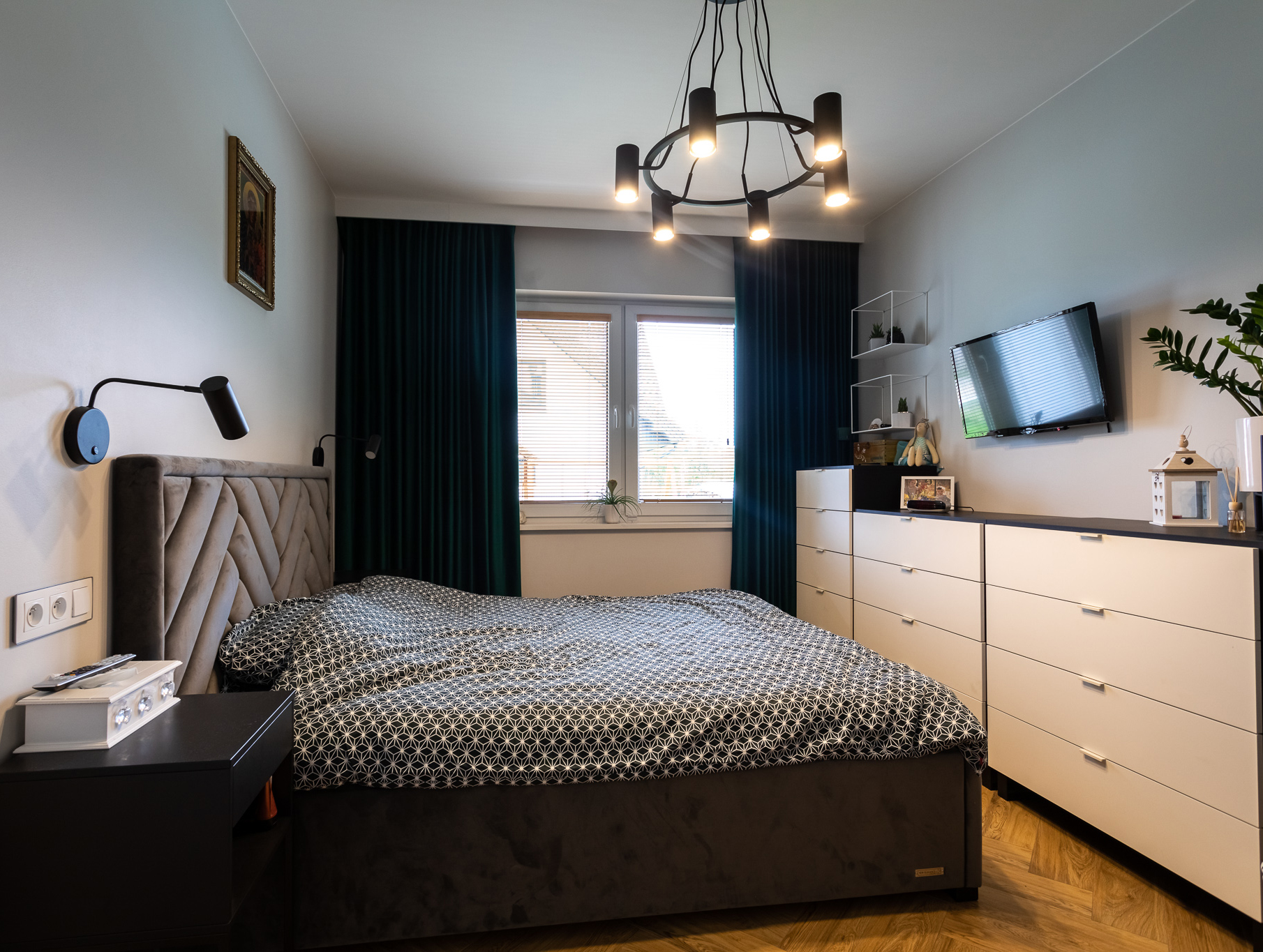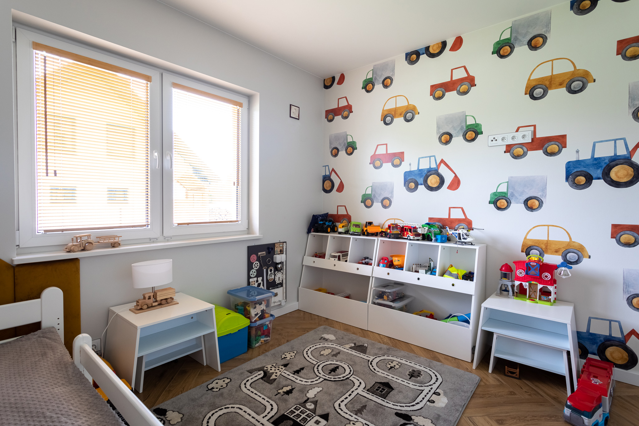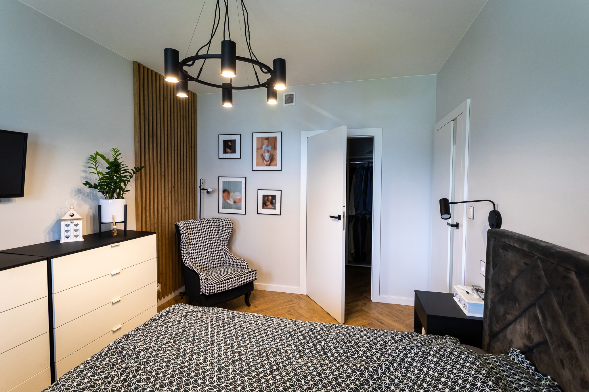 Zakres projektowy obejmował cały dom: przedpokój, kuchnię, spiżarnie, jadalnię, salon, korytarz, WC, łazienkę, sypialnię z garderobą, pokój starszego dziecka, pokój młodszego dziecka.