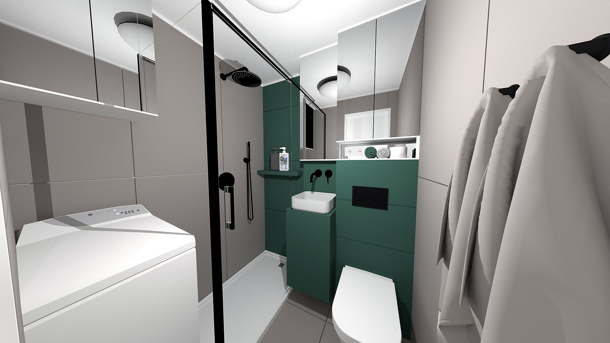 Najmniejsza łazienka w dziejach moich projektów 🙂 wymagała zastosowania większego rozmiaru płytek, aby choć optycznie ją powiększyć. Zastosowałam płytki Tubądzin Cielo E Terra w formacie 59,8×119,8 ułożone z pionie. Do tego piękny akcent kolorystyczny w postaci płytek Tubądzin By Maciej Zień Fashion Green.